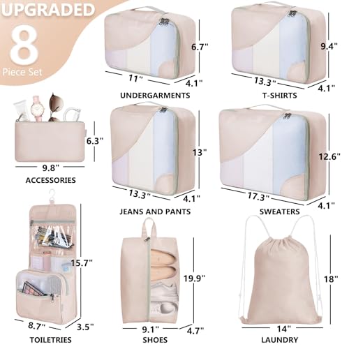 10 Set/8 Set Packing Cubes for Travel, Anti-Tearing Suitcase Organizer for Luggage with Shoe & Hanging Toiletry Bag,Gifts for Women Mom,OlarHike Vacation Essentials & Accessories for Cruise Ship,Cream