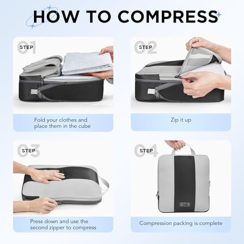 Maximize Packing Efficiency – Make Each inch of your luggage count! These compression cubes work like a mini vacuum sealer, the usage of an extra outer zipper to reduce bulk and create more space. Pack more clothes without sacrificing options—your favorite outfits, now Trip-Able.
