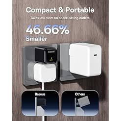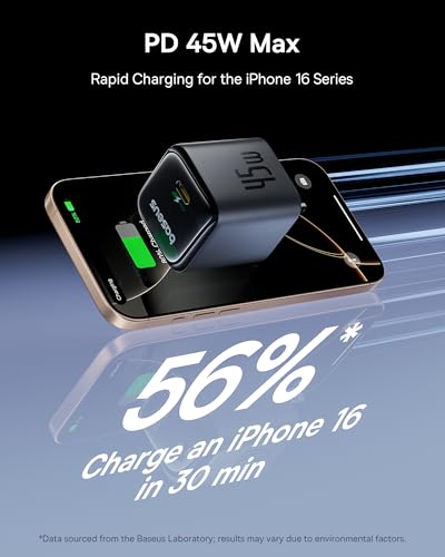 45W Fast Charging: Baseus 45 watt usb c charger with latest PPS/PD 3.0 fast charging technology, charge your iPhone 16 series and Galaxy S24 in record time with this powerful 45W USB-C charger. Enjoy up to 56% battery for iPhone 16 and 61% for Galaxy S24 in just 30 minutes. For Super Fast Charge 2.0, use a 5A charging cable.