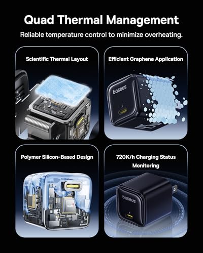 Quad Thermal Management: The usb c fast charger equipped with advanced graphene cooling, scientific stacking thermal layout, polymer silicon-based design, and 720K/h charging status monitoring, this fast charger USB-C ensures optimal heat dissipation for faster charging and enhanced device protection.