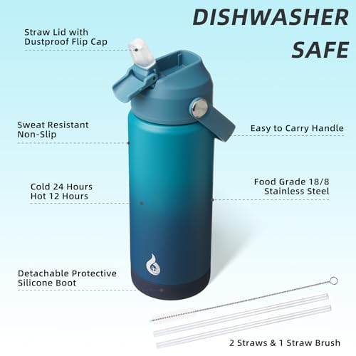 NON-SLIP PROTECTIVE BOOT & DISHWASHER SAFE: This stainless steel water bottle comes with a detachable silicone boot to give protection to the bottom from bump damage. The wide mouth design of our water cup allows for easy filling, pouring, and cleaning. With 2 straws and 1 straw brush, you’ll easily clean the nozzle and straw with straw brush. It’s also dishwasher Secure, saving you time and effort in maintaining its cleanliness and hygiene