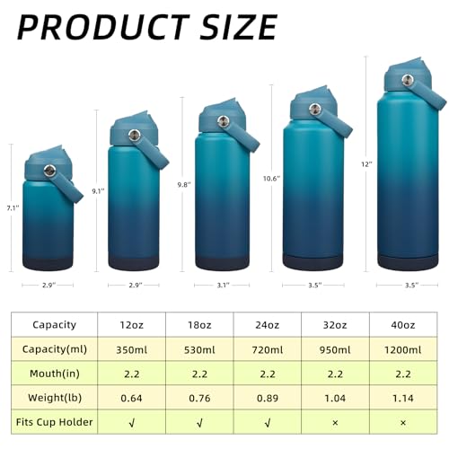 MULTIPLE CHOICE & REUSABLE: Comes with multiple fashion colors and more than a few sizes (12 oz, 18 oz, 24 oz, 32 oz, 40 oz) to make a choice from according to your need. 12 oz, 18 oz and 24 oz cups can put in your car cupholder. Get more out of your outdoor adventures with our reusable water bottle that may be refilled multiple times, reducing single-use plastic waste and promoting a sustainable lifestyle