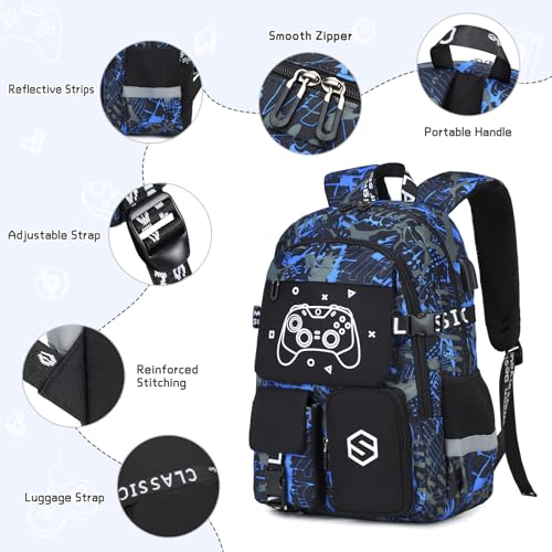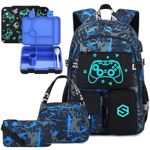 Boys Backpack, Cool Luminous Gamer School Backpacks for Boys with Kids Bento Lunch Box Lunch Bag Pencil Case, Kids Backpack Book Bags for Kindergarten Elementary Middle School