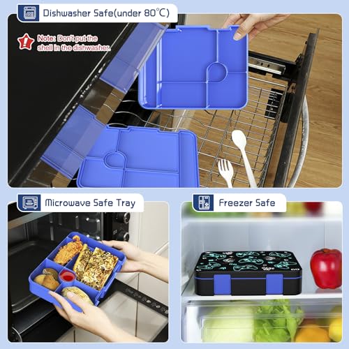 Leak-Proof Kids Bento Box: Kids leak-proof bento snack lunch box with cutlery set made of food-grade safety materials, BPA-free, 6 individual seal compartments, 1300ml large capacity allowing you to pack a balanced meal. Silicone seal assists in keeping 100% leakproof, kids-friendly latches easy to open. But even so, removable food tray are top-rack dishwasher-Protected and microwave-Protected.