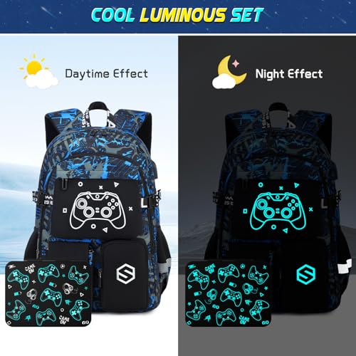Cool Luminous Boys Gamer Backpack Set: Perfect 4pcs boys backpack for school with leak-proof bento lunch box, lunch bag and pencil case, meets all you need back-to-school! The stylish cool luminous school backpack and kids lunch box for boys after absorbing light for about 15 minutes, you can see the fluorescent effects of the print in the dark. Your little boy will love this cool luminous school bookbag set.