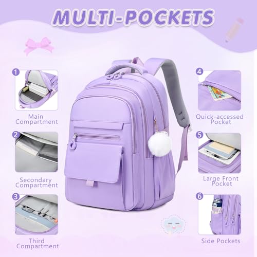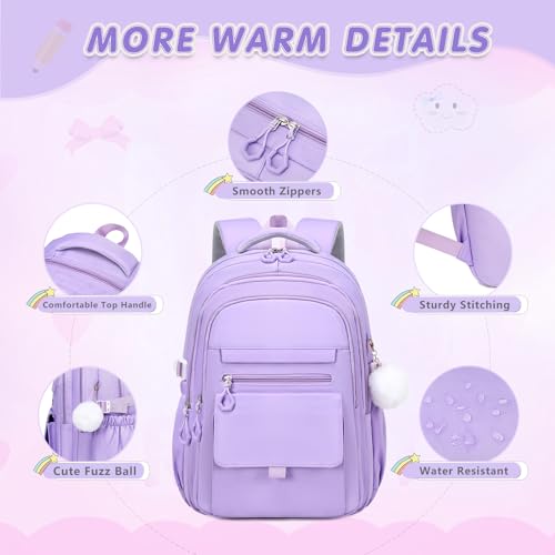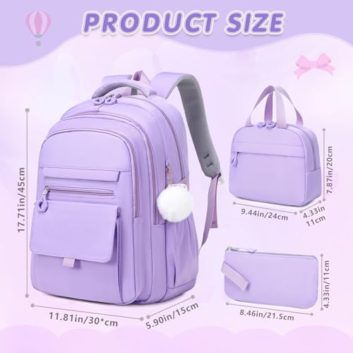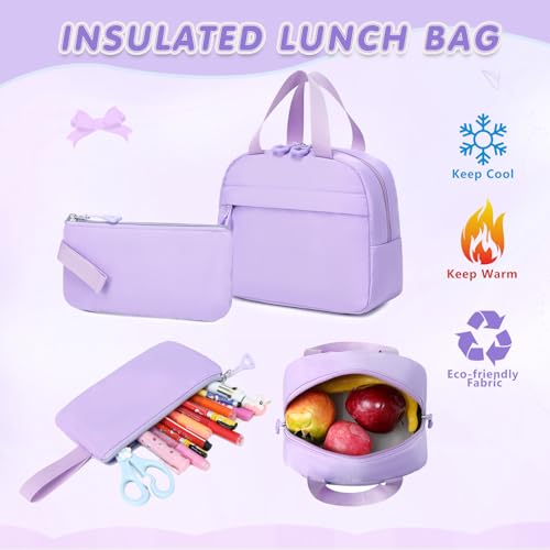GeeWin Purple Backpack for Girls, Bookbag for Girls, School Bags for Kids Children Elementary Middle School Student, 3-In-1 Waterproof Stylish Girl Bookbag with Insulated Lunch Bag & Pencil Pouch