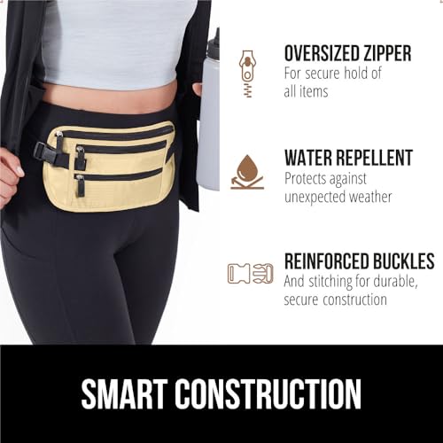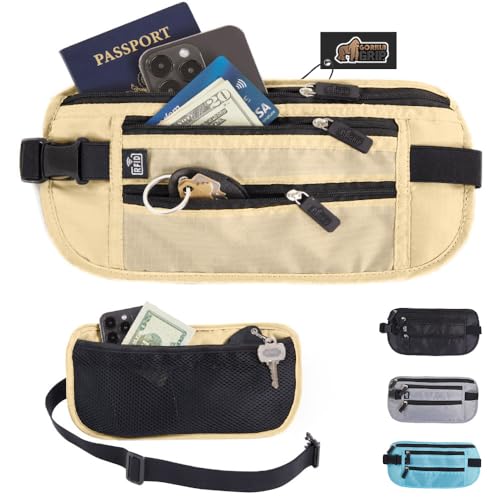 GORILLA GRIP 4 Pocket Secure RFID Blocking Money Belt, Anti Theft Hidden Fanny Pack for Passport and Credit Cards, Water Repellent Travel Pouch for Men Women with Adjustable Waist and Zippers, Sand
