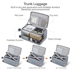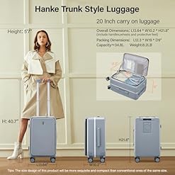 【Trunk Style Luggage with Dividers】The trunk luggage with spinner wheels is integrated deep storage,carry on suitcase with flexible dividers and dry wet separation pockets inside, ensuring orderly storage of items.The size of the 20 inch suitcaseoverall dimensions is L13.64*W10.2*H21.8″(include handles,wheels and protective feet),packing dimensions is L12.3*W19*D9″,capacity≈34.8L,weight 8.2LB. It’s a carry on luggage airline approved that fit in the overhead cabin.