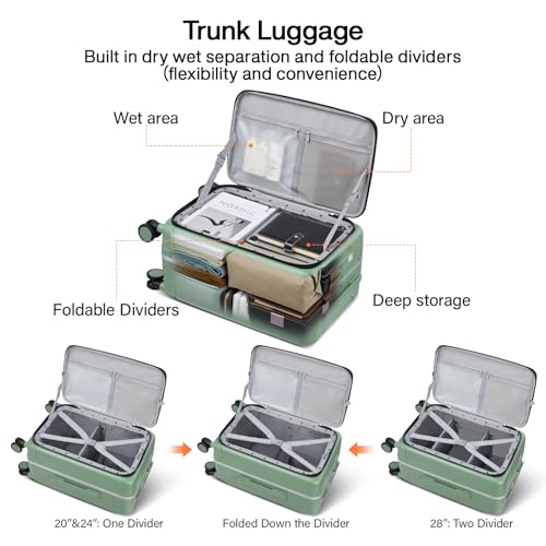 【Trunk Style Luggage with Dividers】The trunk luggage with spinner wheels is integrated deep storage,rolling luggage with flexible dividers and dry wet separation pockets inside, ensuring orderly storage of items.The size of the luggage 28 inch overall dimensions is L18.3*W12.9*H30.6″(include handles,wheels and protective feet),packing dimensions is L17*W27.8*D11.7″,capacity≈91L,weight 13.8LB. It’s a check in luggage.