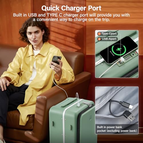 【Quick Charger Port】This large luggage with charger built in USB and TYPE C charger port,you only need to connect the power bank to the cable in the pocket inside and the travel suitcase will provide you with a more convenient way to charge your electronic devices on the trip.
