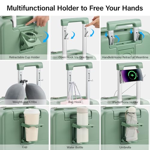 【Multifuctional Holder】This suitcase with cup holder is convenient to place drinks, water bottle, etc. And amazingly the hard case luggage has a phone/IPAD holder on the handle and it also be as a hook while traveling to hang your bag, U-shaped pillow.