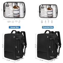 Size: 12.2x6x17.3inch, capacity 35L, capacity may also be expanded to 40L after opening the middle zipper. With 4 large compartments and 6 pockets, it fits a 17.3in laptop, this can be a good companion for a 3-5 day shuttle. Large Toiletry Bags size: 8×5.9×2.4in, small toiletry bags size: 6.7×4.7×2.4in.