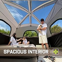 【Excellent Views & Ventilation】The top of our cabin tent uses a large area of mesh to provide you with a better view at the same time as ventilating, when the top rainfly is got rid of at night, this tall tents for camping can be used as a stargazing tent. The tent is equipped with 5 large windows, which can quickly remove the heat out of the tent and provide you with a better camping experience.