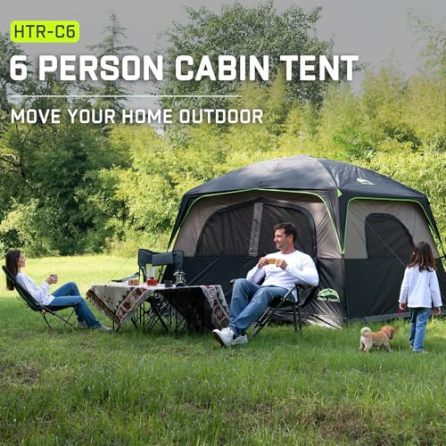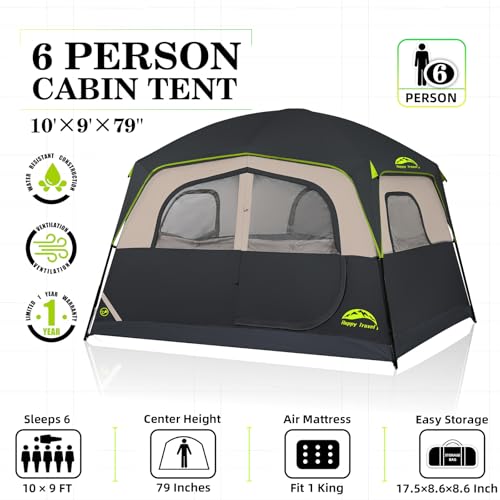 Happy Travel Tent 6 Person Tents for Camping, Waterproof Easy Setup Camping Tent with Rainfly, Portable Large Family Cabin Tent with 5 Large Mesh Windows and Carry Bag for Outdoor Camping & Hiking