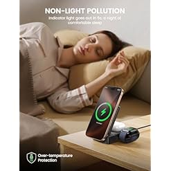 Treasure intimate design: This foldable wireless charging station for MagSafe features 3 indicator lights on the front, which light up accordingly right through charging, but only for 5s to make sure a comfortable sleeping experience. And magnetic charging station is enhanced with an non-slip pad for your earphones and a silicone anti-slip pad at the base, ensuring both the stability of your charging devices and the safe use of the stand.