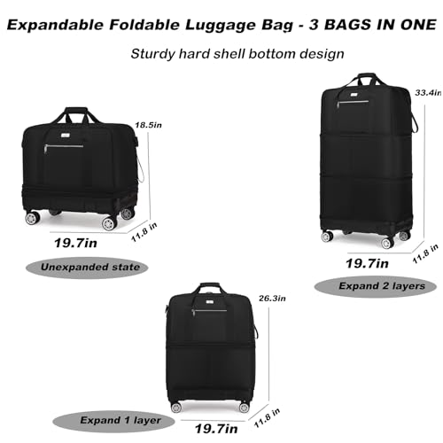 【SIZE】This luggage bags for trip folds down to a compact 19.7″(L) x 11.8″(W) x 5.9″(H) easy-to-store pouch when not in use.There are two layers of the foldable suitcase with wheels,the basic size of the rolling expandable duffel bag is:19.7 in (L) x 11.8 in (W) x 18.5 in (H); First zipper opened: 19.7 in (L) x 11.8 in (W) x 23.6 in (H);Second zipper opened: 19.7 in (L) x 11.8 in (W) x 33.4 in (H); The weight of the luggage is 6.6 pounds