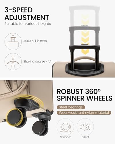 【Durable & Smooth-Silent Mobility】Made from premium water- and scratch-resistant canvas, this soft carry-on luggage withstands travel rigors. Its 360° silent spinner wheels feature a precision shaft and thickened design for wear resistance, quiet operation, and superior load capacity.