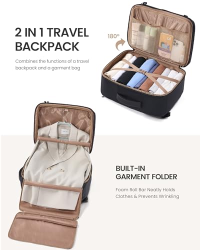 【Travel Backpack&Garment Bag】 This innovative backpack seamlessly combines a travel backpack with a garment bag, featuring foam roll bars that securely hold suits, shirts, and dresses in place, keeping them wrinkle-free during trip and transit.