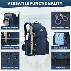 Spacious And Organized Storage Space: The large capacity hiking backpack measures about 13.4*8.6*22″ (W*H*D), capacity: 40 liters. lightweight backpack is equipped with a spacious backpack with zippered main compartment, 2 front zippered pockets, 2 waist zippered pockets, 2 side pockets and 2 mesh pockets, which can efficiently store and categorize different items