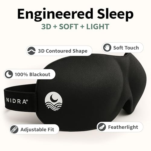 Nidra Contoured Sleep Mask for Side Sleepers, Zero Pressure Fit, 100% Light Blocking Eye Shades for Sleeping & Travel, Lash Extensions, Adjustable Strap, Ultra-Soft Comfort (Standard Size, Black)