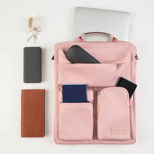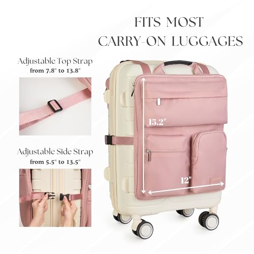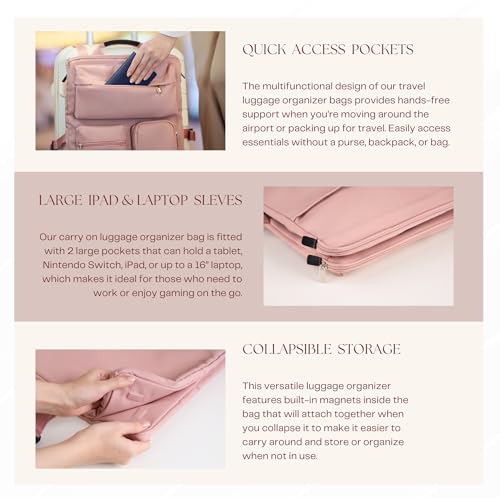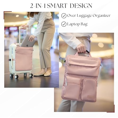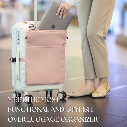 Over Luggage Organizer for Carry On Bag or Suitcase with Storage Pockets, 16” Laptop Sleeve with Handle, Travel Accessories Bag, Slide On Luggage Harness with Adjustable Straps (Pink)