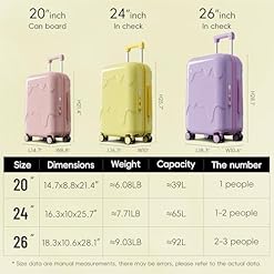 【Product packaging and product content】FREE Clear PEVA Suitcase Cover Protectors & Luggage Tags Suitcase interesting stickers. 20 inch luggage measures 14.76”x8.86”x21.46”(Height of wheels included)Luggage weight 6.08 LB ; packing dimensions are 15.15” x 9.84” x 22.44”, Packing Weight 7.94 LB.