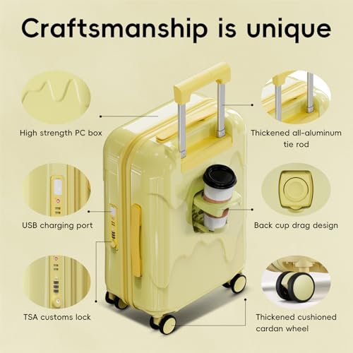 ROAMING 20-Inch Carry On Luggage Airline Approved Lightweight PC Hardside Rolling Suitcase with TSA Lock Cup Holder USB Charging Port and Spinner Wheels for Women Ice cream suitcase Cheese yellow
