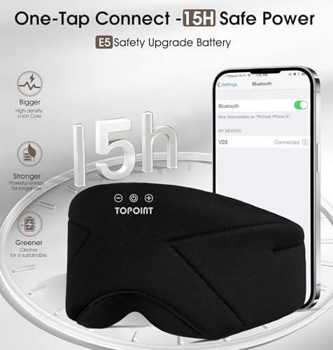 Total Darkness, Zero Pressure Fit: TOPOINT Bluetooth Sleep Mask full-wrap Ergo-Tapered Occlusion Design—engineered to block 98% of ambient light while hugging your head gently. A widened center relieves eye pressure, and tapered sides reduce temple stress by 62%. No slipping, no squeezing—just a weightless, full-coverage fit that feels like a gentle hug for your head