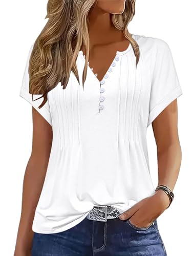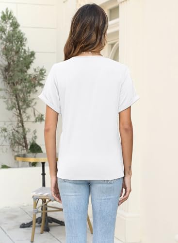 Soesdemo Womens Tshirts Short Rolled Sleeve Pleated Button Down V Neck Casual Dressy Summer Top Business Work Blouses Shirts