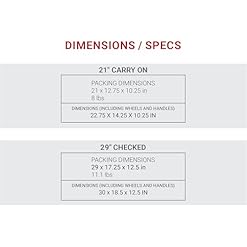 SET INCLUDES: 21” Carry On Spinner (Dimensions: 22.75” x 14.25” x 10.25” and 29” Checked Spinner (Dimensions: 30” x 18.5” x 12.5”, Weight: 11.1 lbs.;)