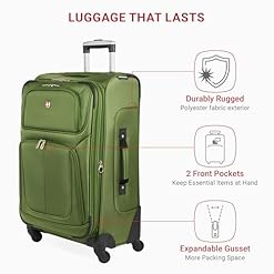 The SwissGear Sion Expandable Spinner Luggage Collection features a locking push/pull care for system and four 360-degree spinner wheels for superior mobility. Made of durable, scuff-resistant polyester fabric, its interior is fully lined and features adjustable luggage tie-down straps, a removable zippered wet bag, a large mesh lid pocket, and a packing pocket for holding small items and accessories. Other features include two front panel pockets, a built-in ID tag, and a padded top snatch care for.