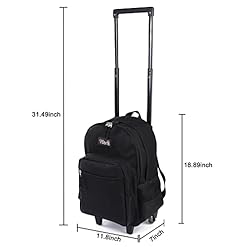 【Size Information】Double hand rolling backpack for boys and girls 18.89” high, side to side width 11.8”, front to back depth 7”, Lunch Bag size: 9.05x 7.48×4.72 inch. this kids luggage is to be had to carry on the roller backpack to the airplane, no necessary to check in when travelling, the wheels are equipped with a cover keeping it from dirty, the cover is hidden in the pocket above the wheels.