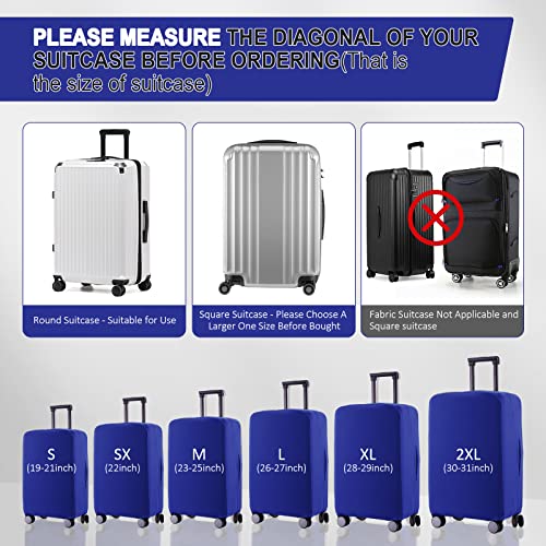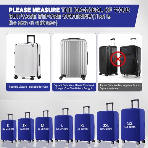 【6 Sizes to Choose】 There are 6 sizes to fit all your needs: S: fit 19-21 inch luggage, SX: fit 22 inch luggage, M: fit 23-25 inch luggage, L: fit 26-27 inch luggage, XL: fit 28-29 inch luggage, 2XL: fit 30-31 inch luggage. Please measure your suitcase before purchasing. (NOTICE: Please NOT include wheels height. The suitcase cover is only suitable for standard sizes. Round Suitcase – Suitable for Use, Square Suitcase – Please Choose A Larger One Size Before Bought, Fabric Suitcase Not Applicable.)