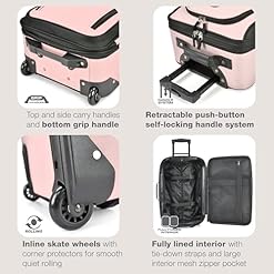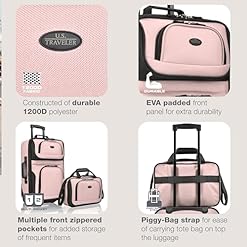 Travel in style with this U.S. Traveler Rio 2-piece Carry-On Luggage Set. It includes a 21″ expandable, wheeled upright and a 14″ boarding bag. Both pieces of the Rio luggage set meet the FAA carry-on regulations. You’ll be able to easily slide the boarding bag over the maintain of the 21″ expandable, wheeled upright, making trip a snap. This US Traveler luggage set’s metal hardware holds up to the rigors of the shipping process. Densely woven, 1200D polyester is very strong and keeps water from seeping in through the outside. The maintain locks in place securely so you do not have to fiddle with it even as you walk. A set of skate wheels make the luggage easier to transport with no need to select it up.