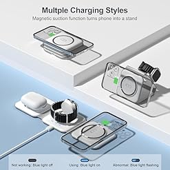 HUNDRED VARIABLE CHARGING METHODS: Using soft silicone to connect the charging pad, the 3 in 1 wireless charging station can instantly transform into a cell phone stand. When charging, the phone can be placed horizontally to watch movies and vertically to video chat. There is a magnetic attraction device on the charging plate, so it will not slip off even if it is shaken. Note: Must be connected to an external power source to use.