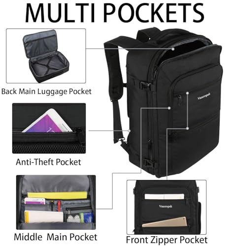 Vancropak Carry On Backpack, 40L Expandable Extra Large Travel Backpack, Flight Approved Water Resistant Luggage Suitcase Daypack, Lightweight College Business Weekender Bag for Men & Women, Black