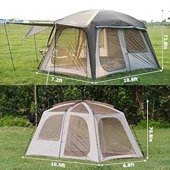 ROOMY FOR 4-6 PERSON TENT: The tent is perfect for 4-6 person out of doors camping. With the size of 10.5ft x 6.8ft x 70.8in(H) (71.4 sq ft). 2 queen air mattresses (6.7ft*5ft/200cm*150cm, thickness below 7.8in) or 4-6 sleeping bags are well fit in the tent. Ideal for family out of doors camping.