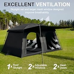 【Breathable Mesh Windows & Skylight】Dual-layer mesh panels + adjustable ceiling vents boost airflow – reduce condensation and enjoy breezy views without bugs. Ideal for hot summer camping or humid forest trips where ventilation is key.
