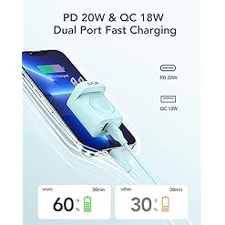 🎁【Multi Port Fast Charger】Charging block with dual port fast charging, 20W USB-C port and 18W USB port, supports fast charge for mostly PD QC 3.0 protocol devices, you can quick charger for you new iPhone or Samsung phones to 60% battery in 30 mins. meets your daily charging needs.