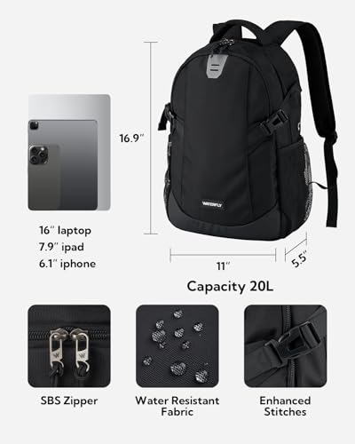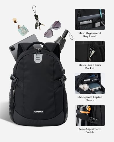 WATERFLY Casual Laptop Travel Backpack: 20L for Men Women Work Commuter Everyday EDC Daypack Hiking Gym Sport Workout Black