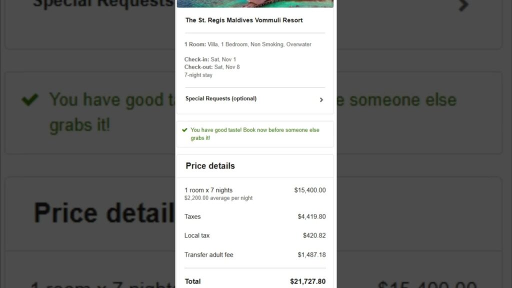 The St. Regis Maldives, Nov 1–8 Overwater Villa on Expedia: $21728 VOA Member Rate: $16834 You save $6802 — that’s 22% … source
